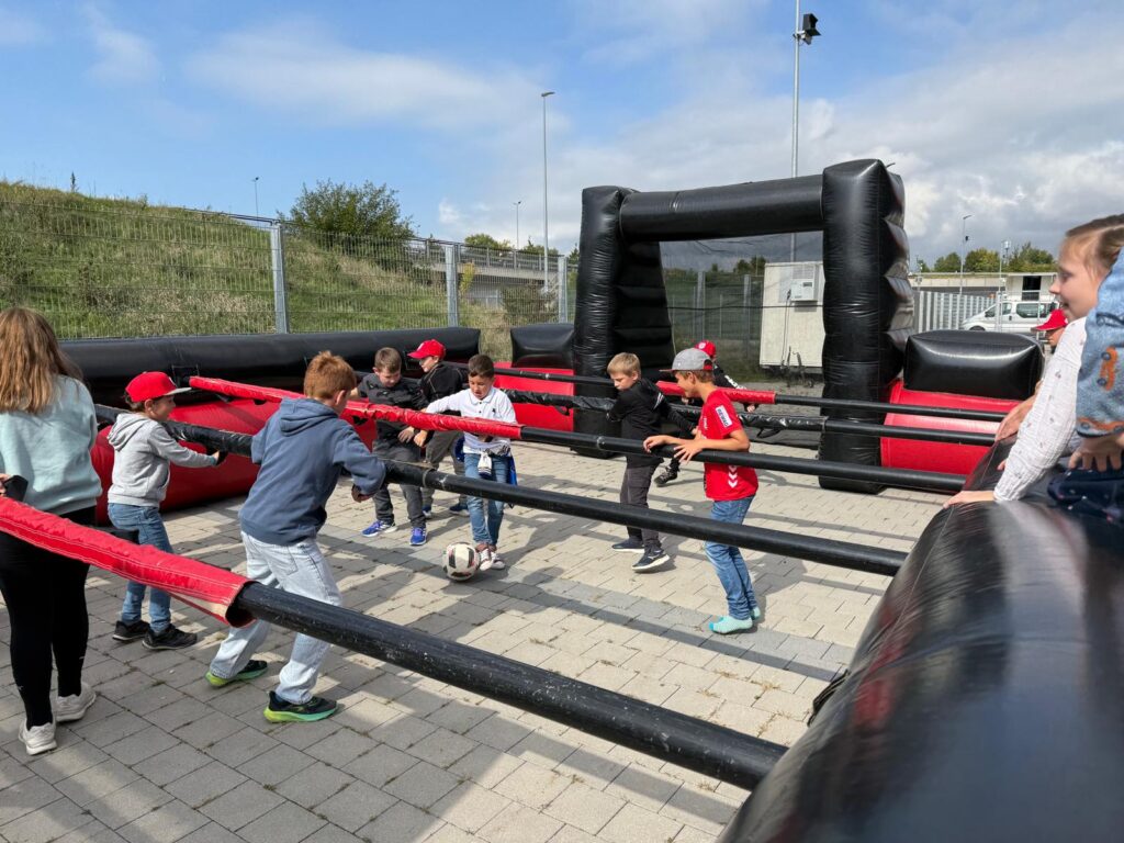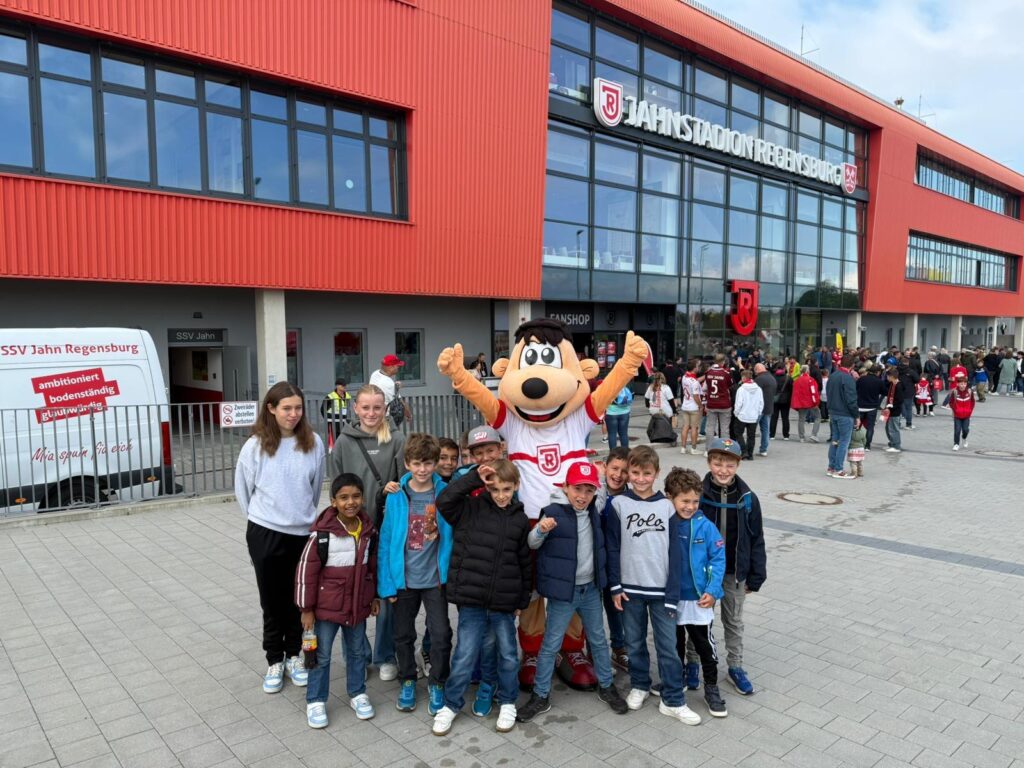 Schon am Morgen startete die Anreise mit dem Zug nach Regensburg, bevor es mit dem Bus direkt zum Jahnstadion ging. Dort erwartete die Kinder ein buntes Rahmenprogramm: Fußball-Dart, Menschenkicker und natürlich ein Erinnerungsfoto mit Maskottchen Jahni sorgten für jede Menge Spaß und Begeisterung.
